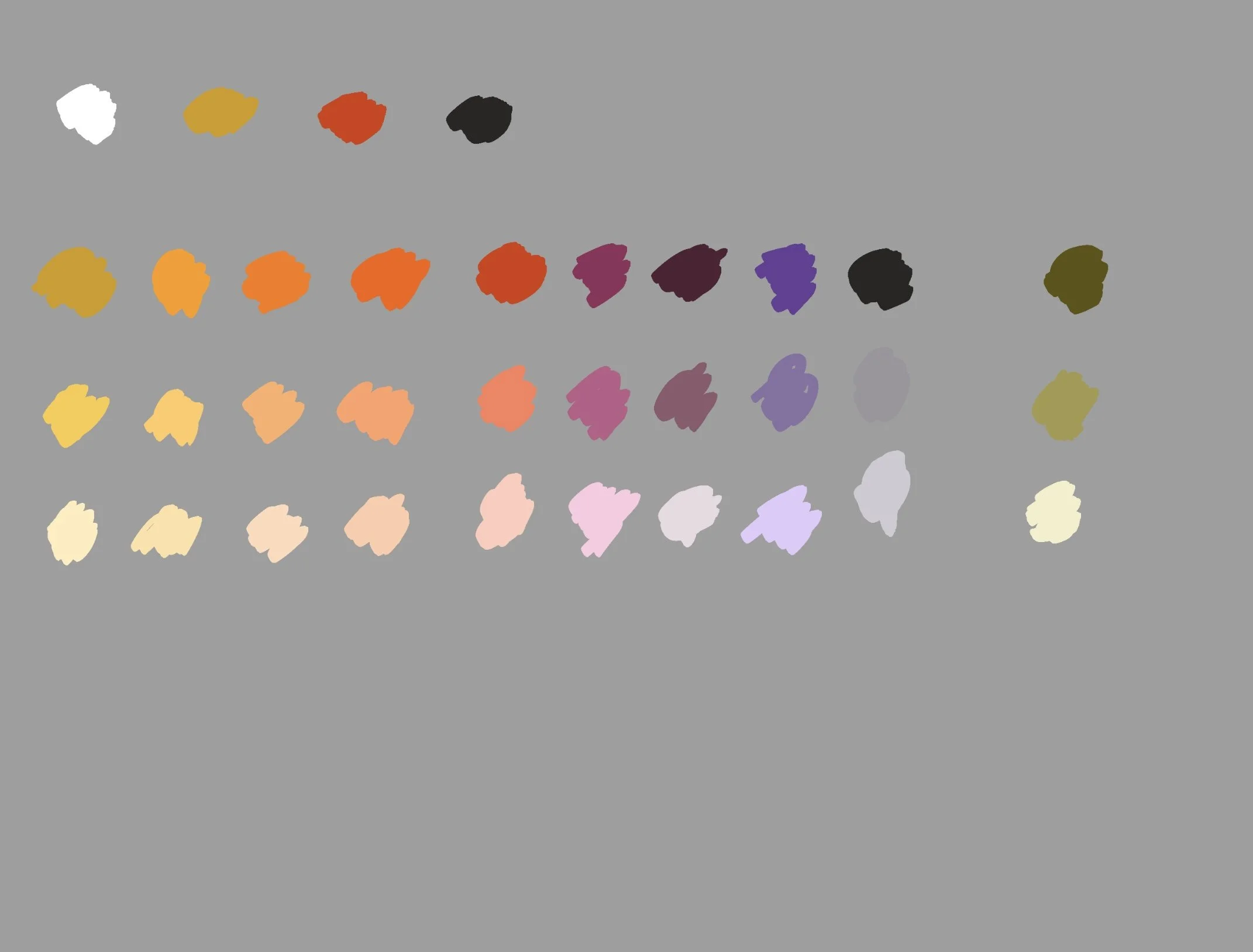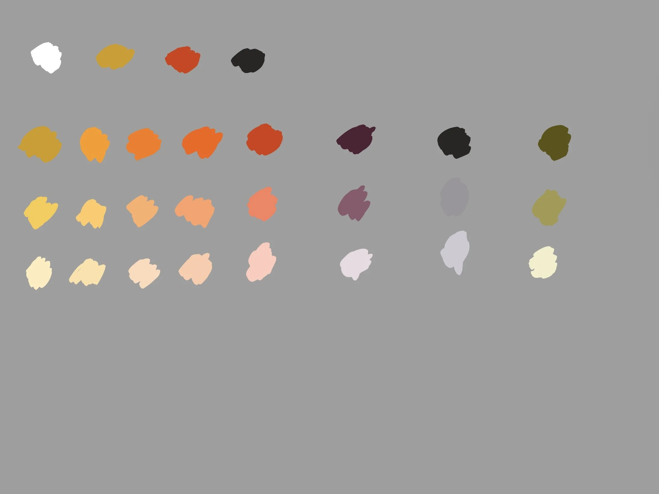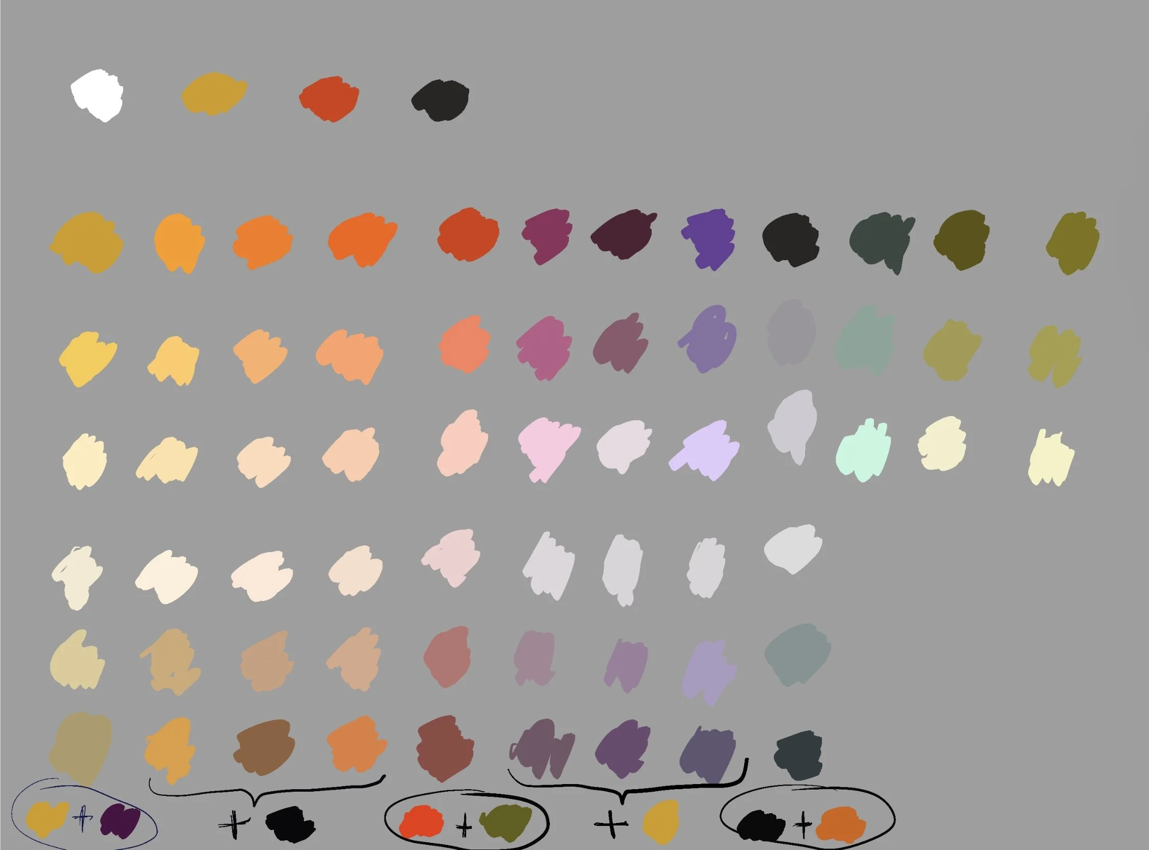 2. Use white to mix different values. Try to make the values of the mixtures across the row match. Notice the amount of white you need for these mixtures, how it changes chroma and maybe even hue (e.g. titanium white makes colors cooler and shifts them slightly towards blue).