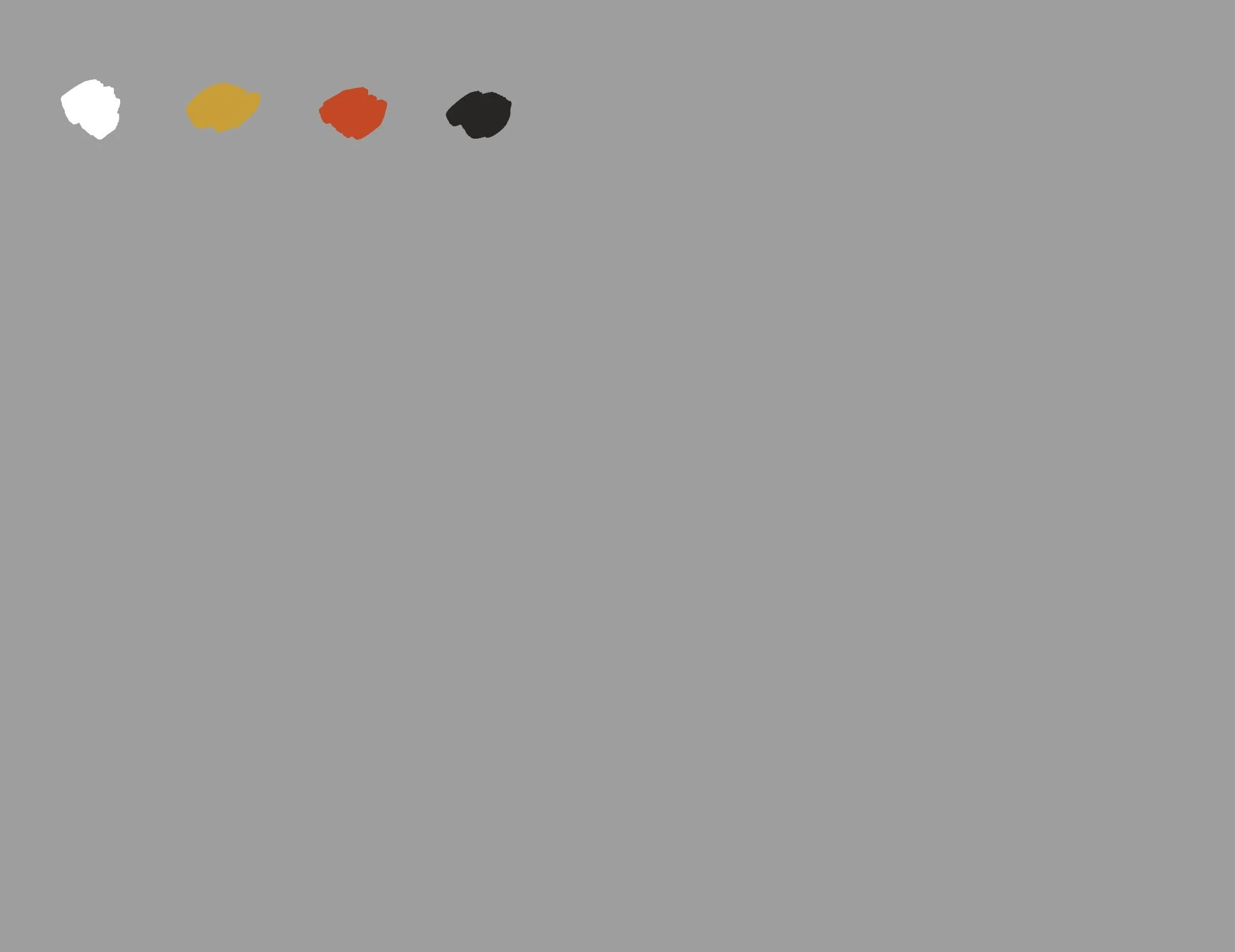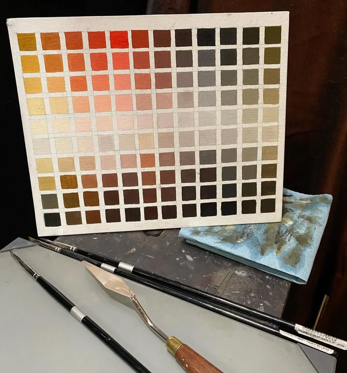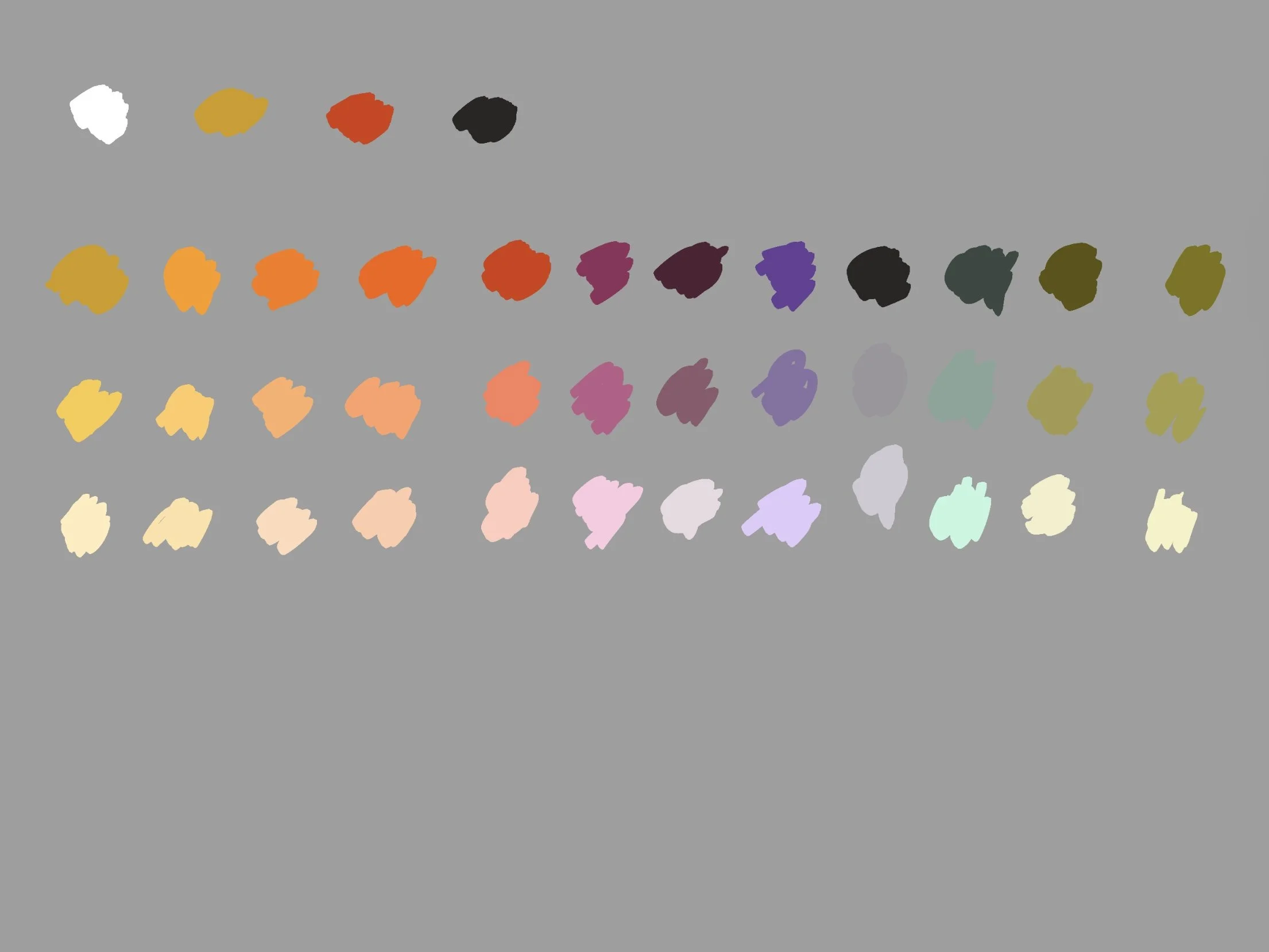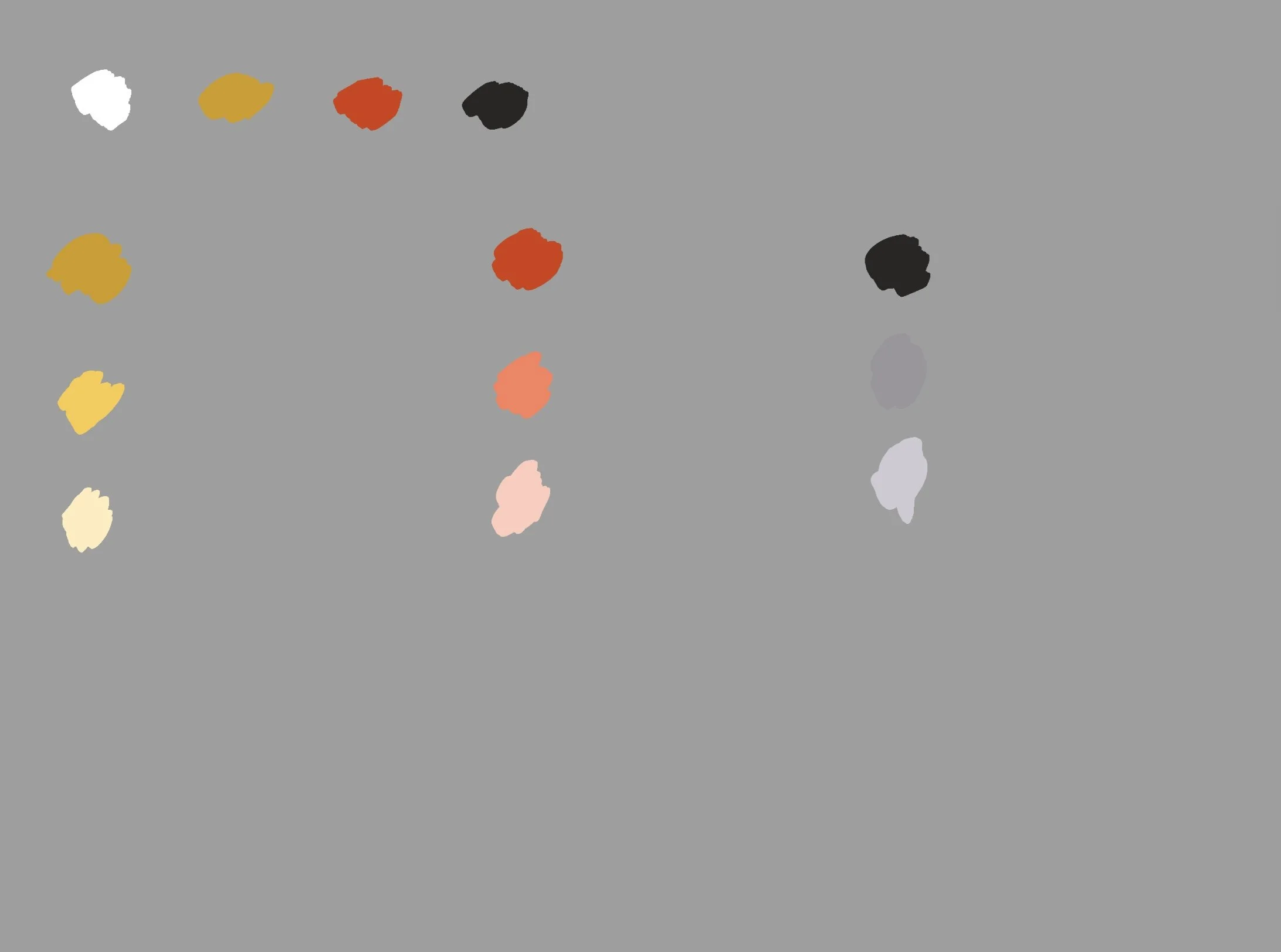 2. Use white to mix different values. Try to make the values of the mixtures across the row match. Notice the amount of white you need for these mixtures, how it changes chroma and maybe even hue (e.g. titanium white makes colors cooler and shifts them slightly towards blue).