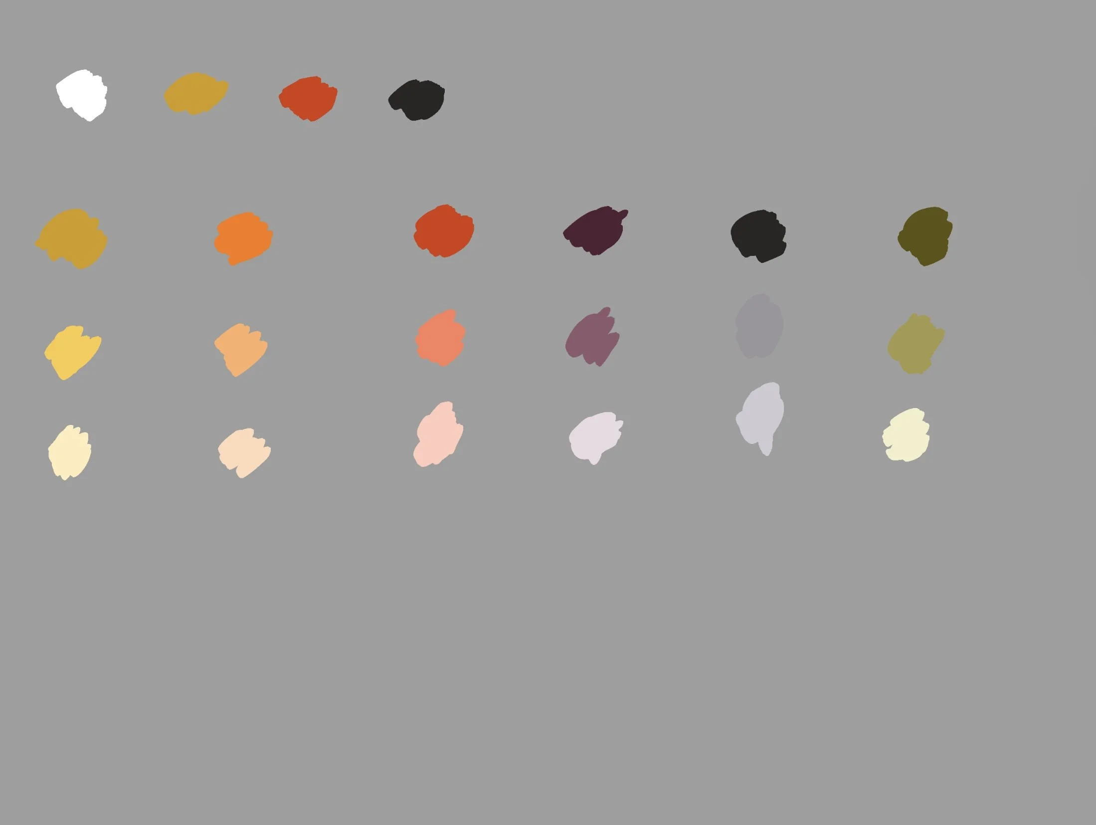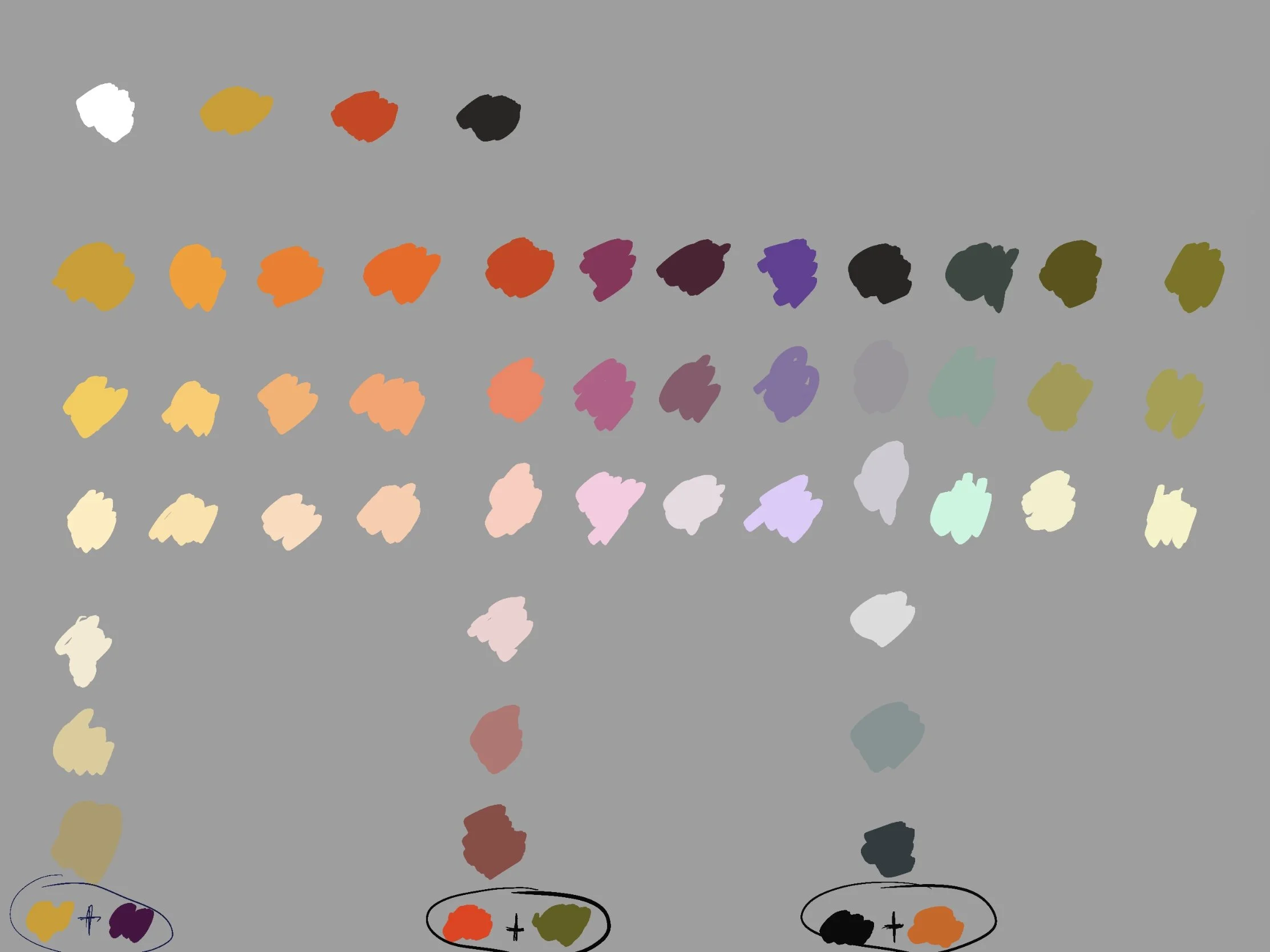 8. Mix green + YO to get yellow green, green + IB to get blue green (it’ll look like warm grey, very low chroma). Mix lighter values. Now you have tertiary colors + different values.