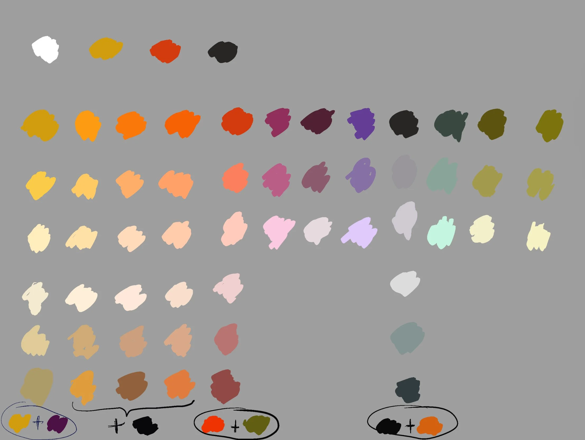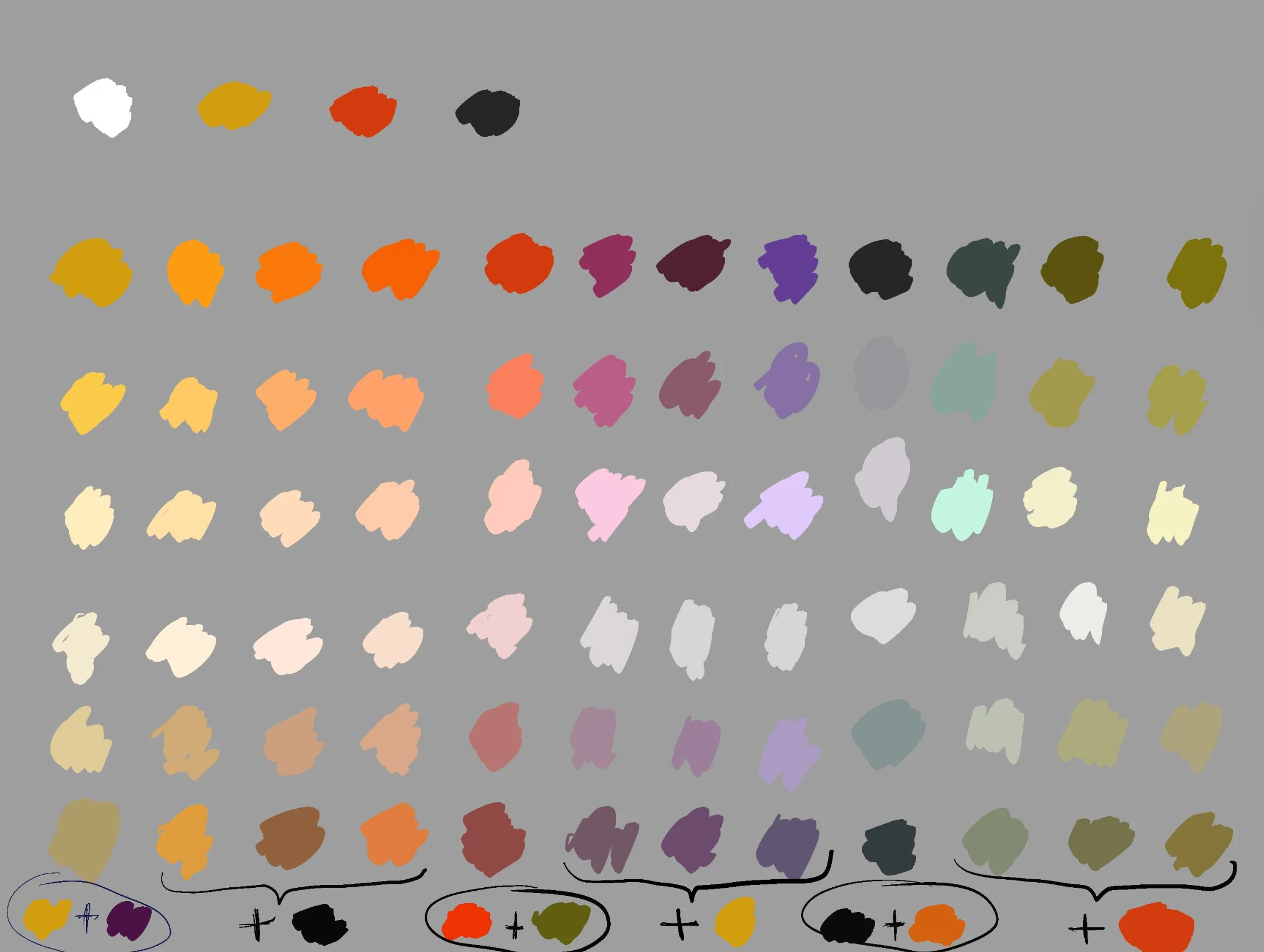 3. Mix YO (yellow ochre) + CR (cadmium red light) to get orange. You will probably need more YO in the mixture than CR because the latter one has a higher tinting strength. Repeat for all values.